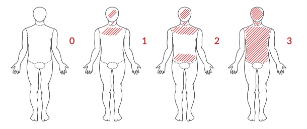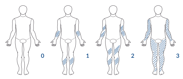 - •An easy-to-apply score based on an estimate of the surface area covered by dermatitis, using burn surface area estimation drawings